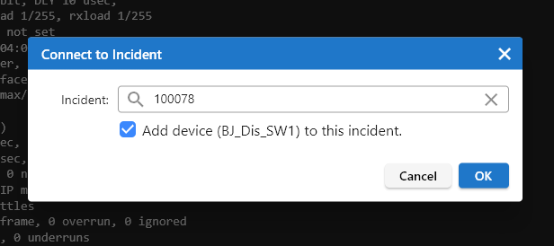 In the Connect to Incident dialog, enter an existing incident name or ID, and select the target one from the matched incidents. By default, the current device is added to this incident.