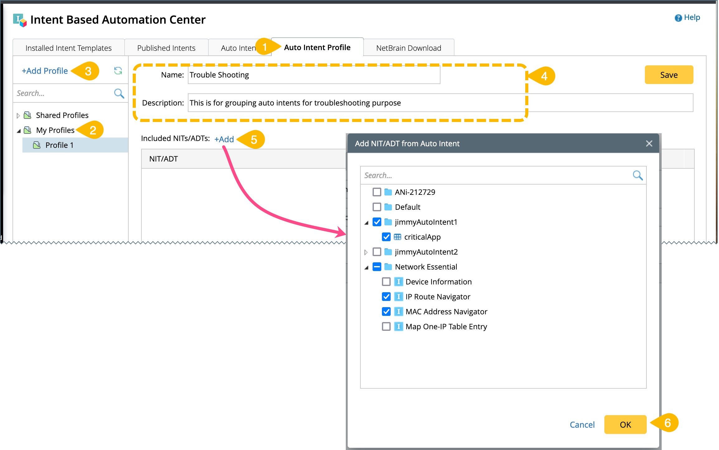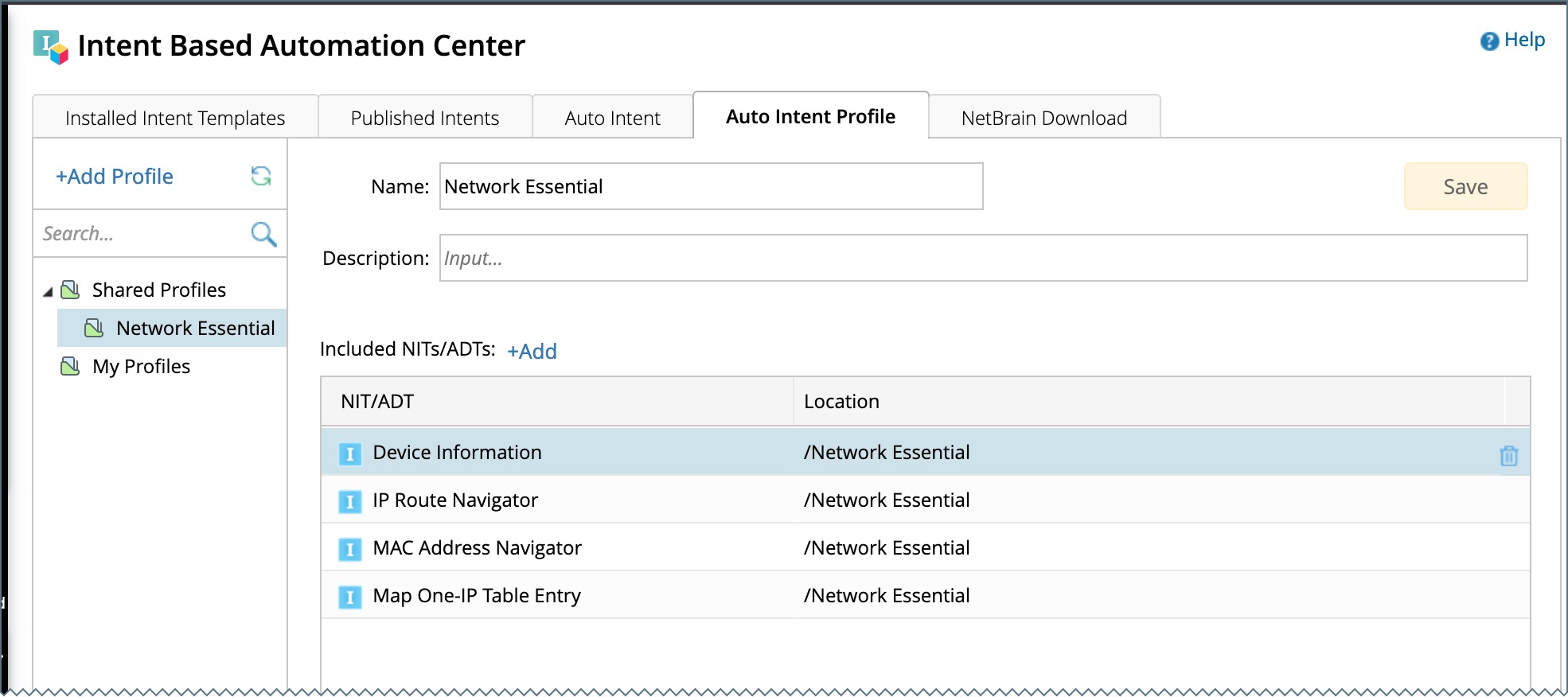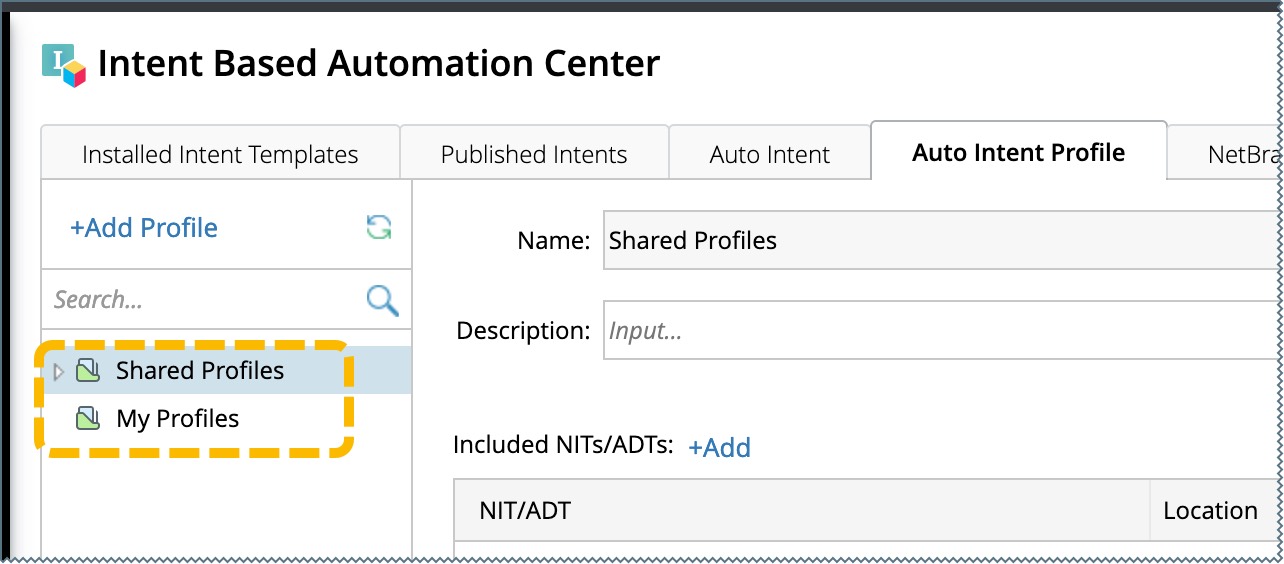 Click + Add in the Included NITs/ADTs block, then select an intent to be added to the profile in the pop-up dialog. Click OK in the dialog. The selected intent will be added as an entry to the Included NITs/ADTs block.