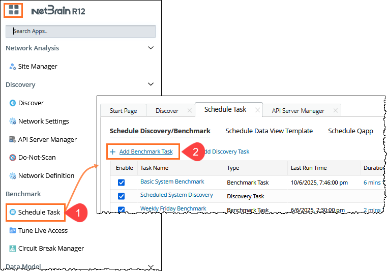 in the Domain Management page and select Schedule Task. - In the Schedule Discovery/Benchmark tab, click Add Benchmark Task.