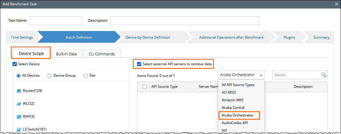- Go to the Device Scope tab, check the Select external API servers to retrieve data checkbox and select the Aruba Orchestrator as a source type.