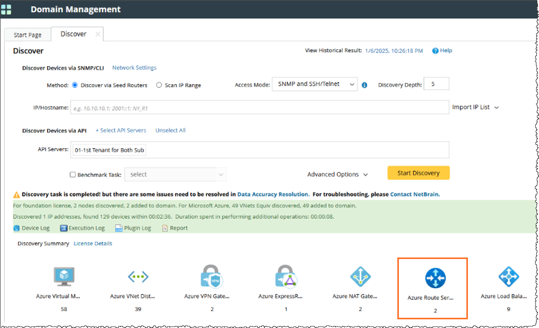 Once configured, initiate network discovery to detect all cloud components, including the Azure Route Server node, as shown below.