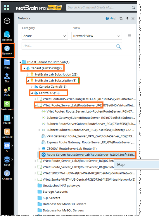 - Network Tree: Locate the Azure Route Server node from Network Tree. The Network Tree provides a structured view, making it easy to locate specific nodes and understand the resource hierarchy within your cloud environment. The hierarchy follows this order: Tenant > Subscription > Region > VNet > Azure Route Server. Right-click the Route Server and open the Map.