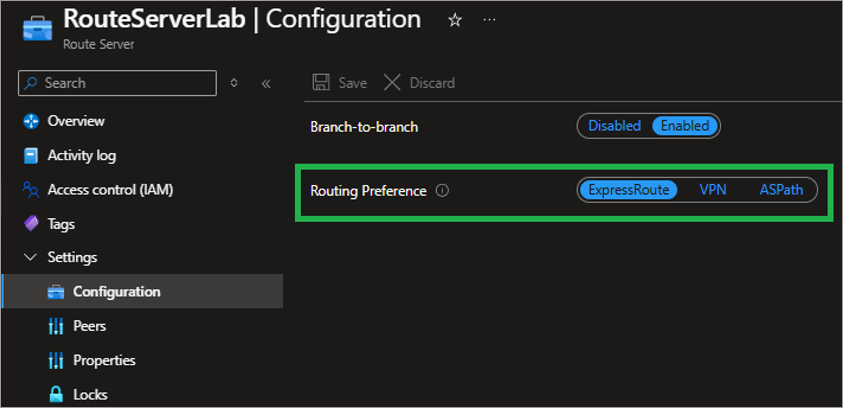 Enable branch-to-branch traffic path and configure route preferences to manage route learning and selection for the Azure Route Server.Branch-to-Branch Traffic Path: