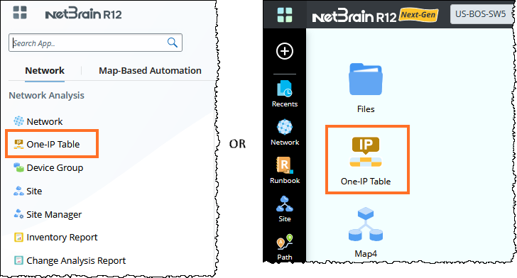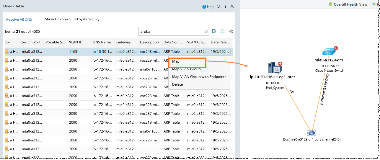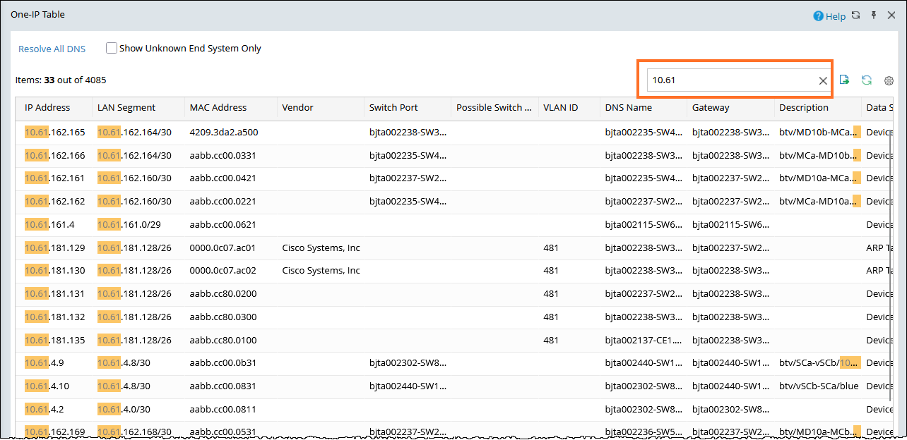 NetBrain supports searching in the One-IP table, and fuzzy match is allowed in the search.