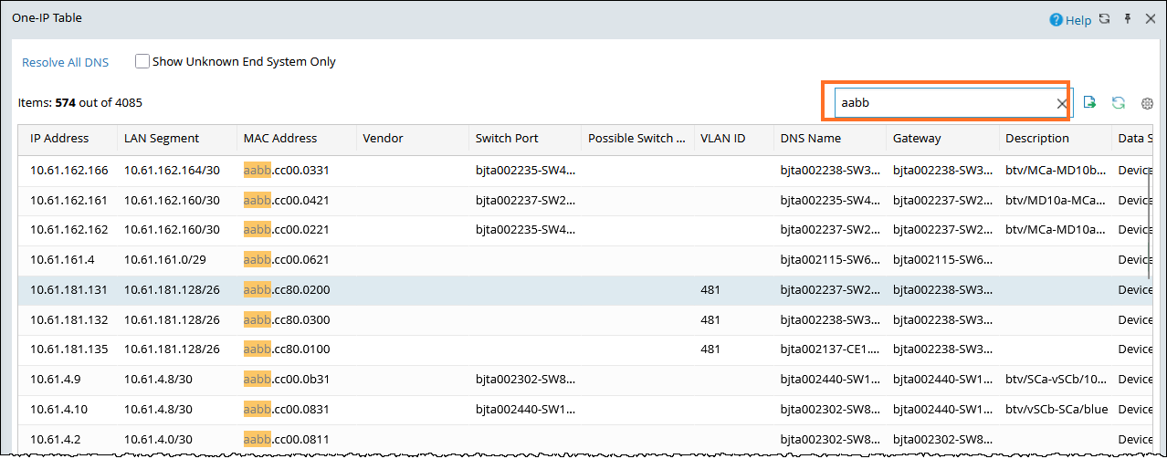 You can search the One-IP table by entering a keyword in the search bar, which can be IP Address/LAN Segment/MAC Address/DNS Name/VLAN Group/VLAN ID/Device Name/Interface Name. All columns of the One-IP table are in the search scope, except for Data Source, Possible Switch Port, Gateway and Data Retrieve.