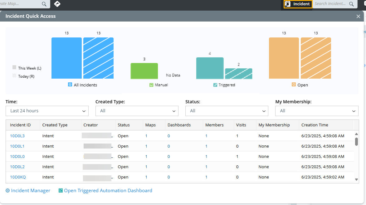 icon in the quick access toolbar to open the Incident Quick Access pane. View the count of the increased incidents in one day or a week. You can also operate on a specific incident, such as opening an incident, adding maps, or inviting members to an incident.