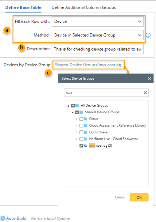 - Devices by Device Group: Select the created device group (for example, device group named aws cost dg (3)) for building the base table with the devices in the device group.
