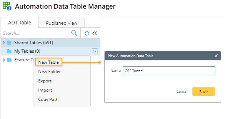 - Open Automation Data Table Manager, then create a new table and name it (for example, GRE Tunnel).