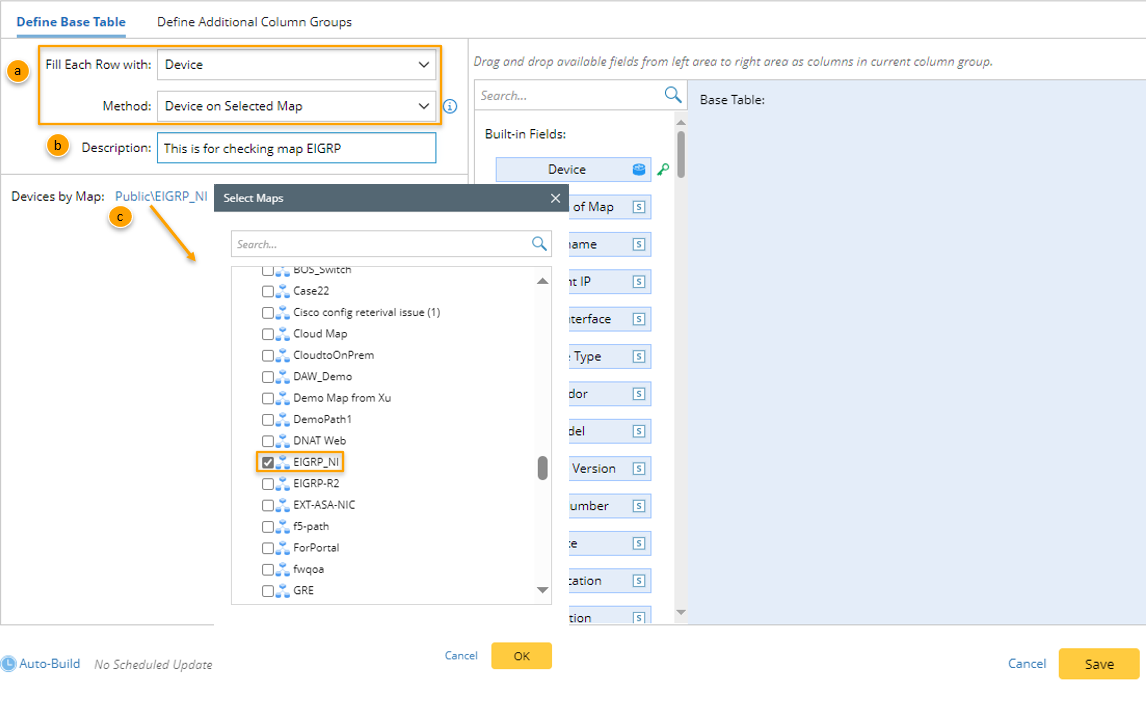 - Devices by Map: Select the created map (for example, device group named EIGRP_NI) for building the base table with the devices on the map.