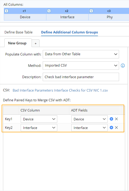 - Define paired keys: Click Add Keys, then select one column from the imported csv and one ADT column to form a paired key. The csv data will be added to the current ADT by referencing this paired key. You can add one or more paired keys.