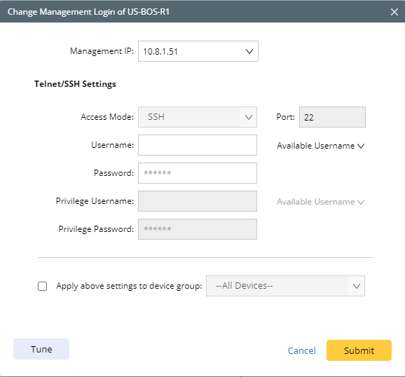 - Telnet/SSH login credential — the username and password used to log in to the device. By default, these credentials come from the Tuning Private CLI Settings process and are only available for the user who configured them in Configuring Private Network Settings.