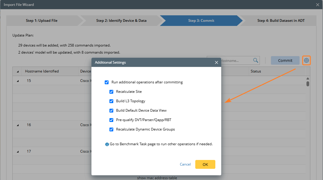 - You can click the setting icon to select the additional operations to be performed after the files are committed to the current domain and parsed to build the device model.