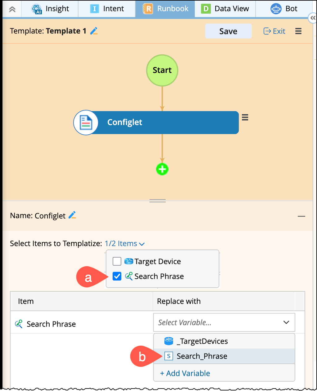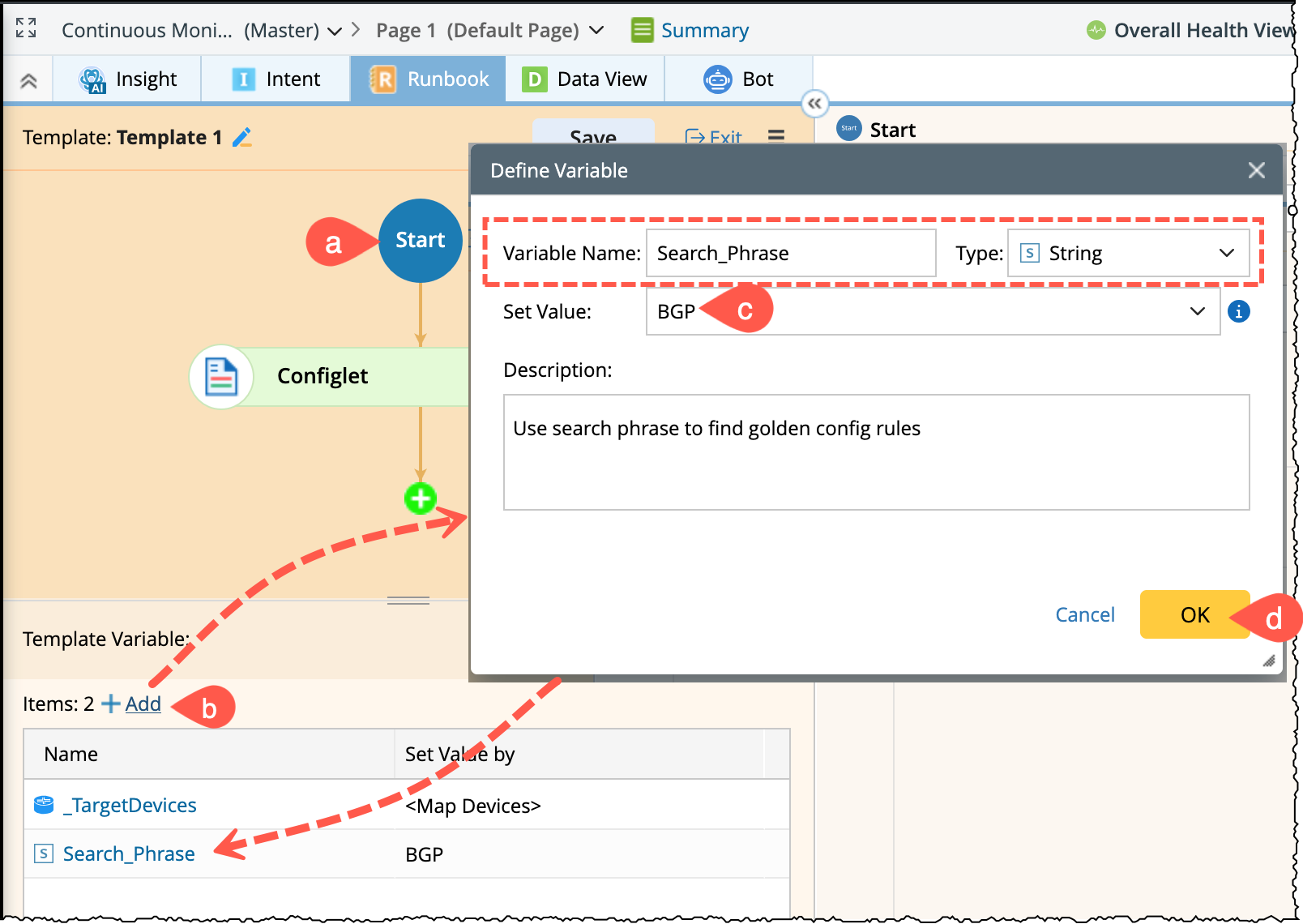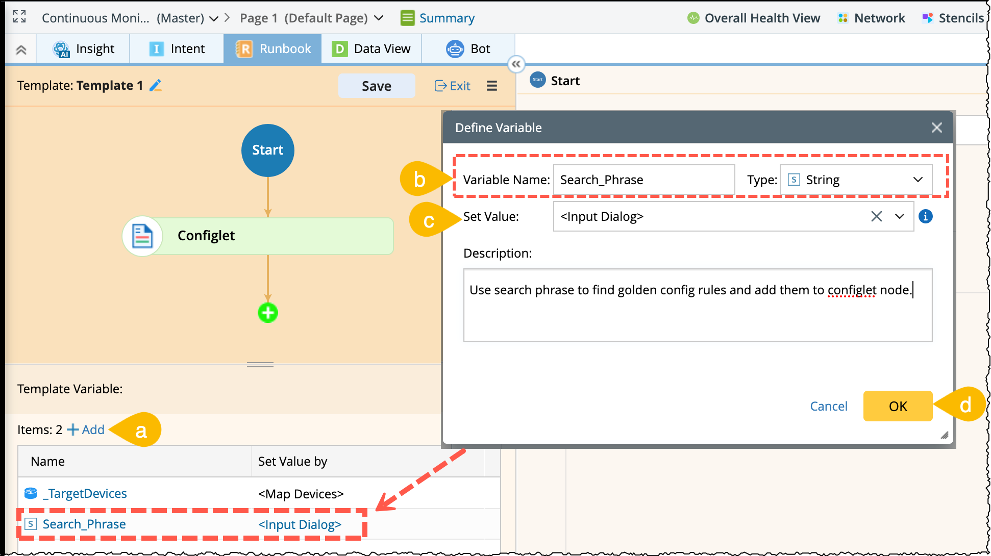 You can dynamically add more golden config rules to the Configlet node using the search phrase passed through a Runbook Template variable. You can select global RBT variables to use as search phrases.