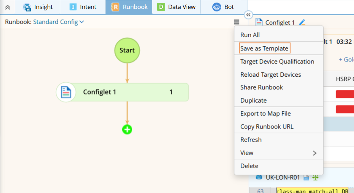 Save a runbook containing a well-defined Configlet node as a Template: