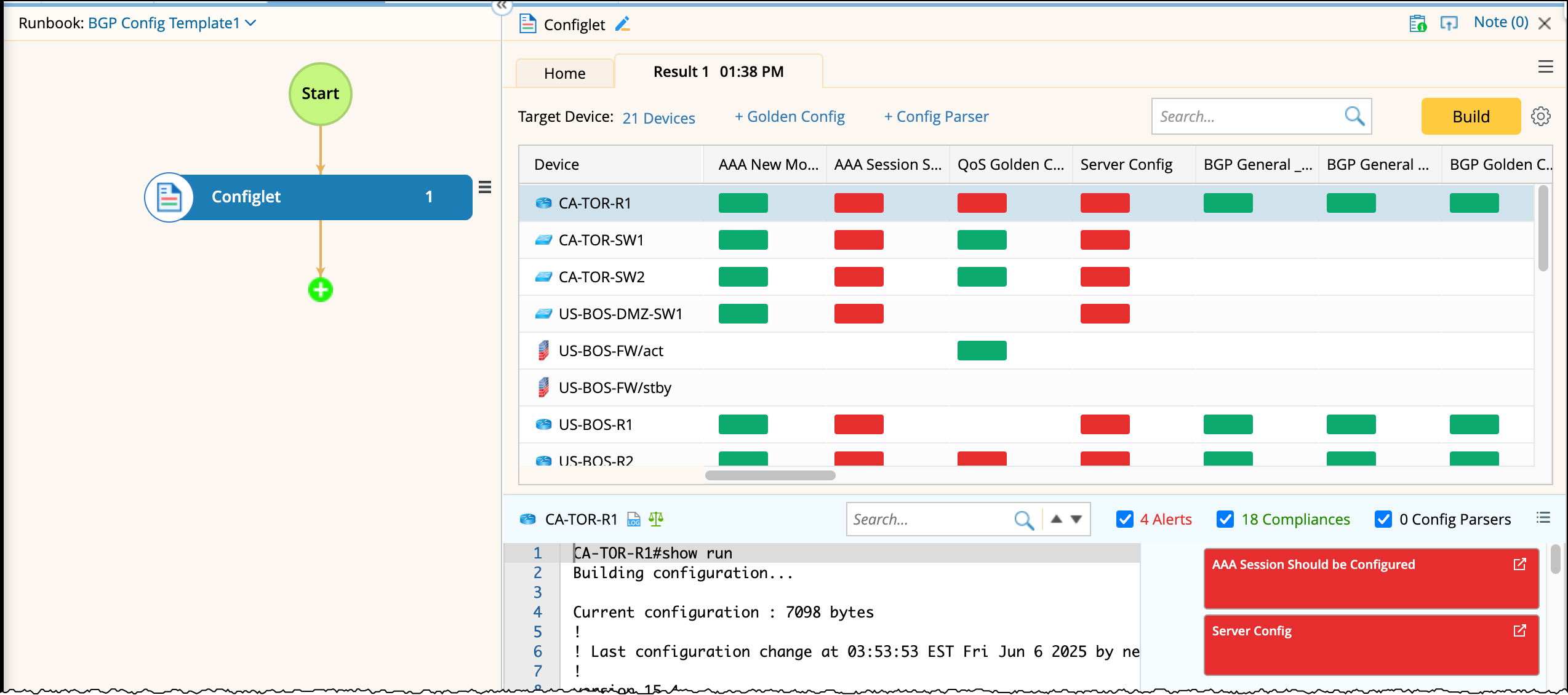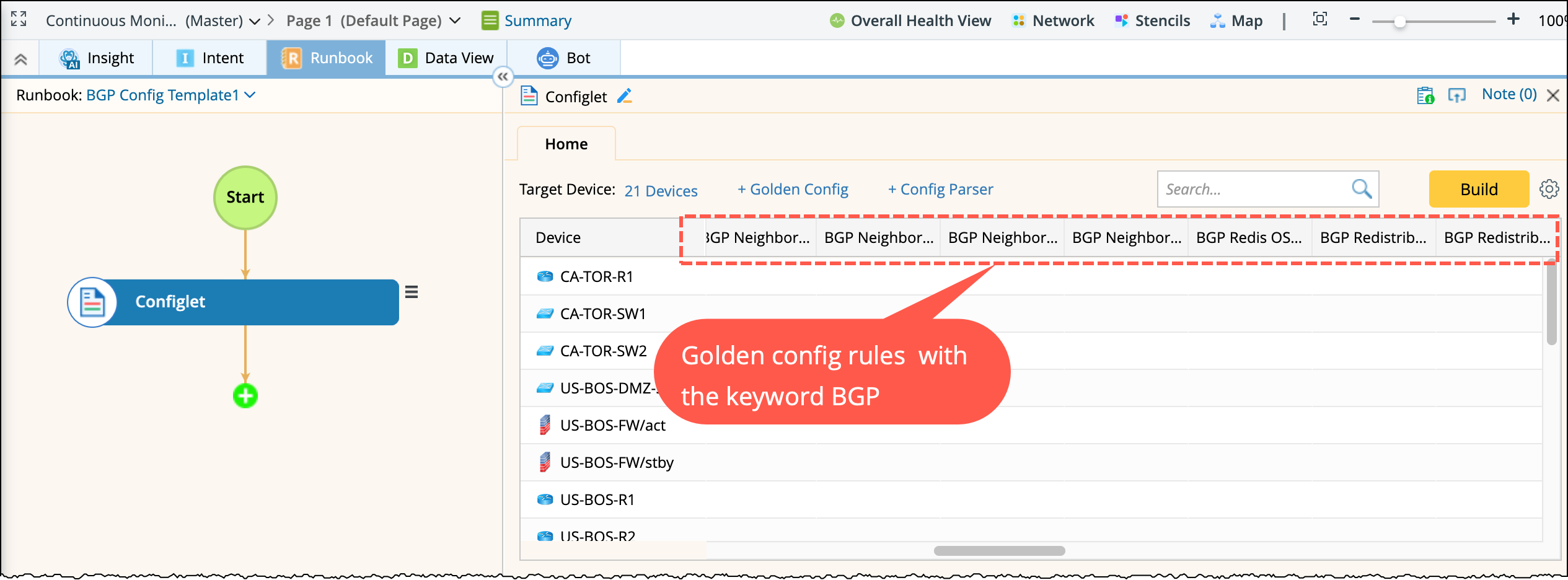 A new Runbook is created. The Configlet node will automatically include golden config rules matching the search phrase BGP. You can edit the Runbook if needed.