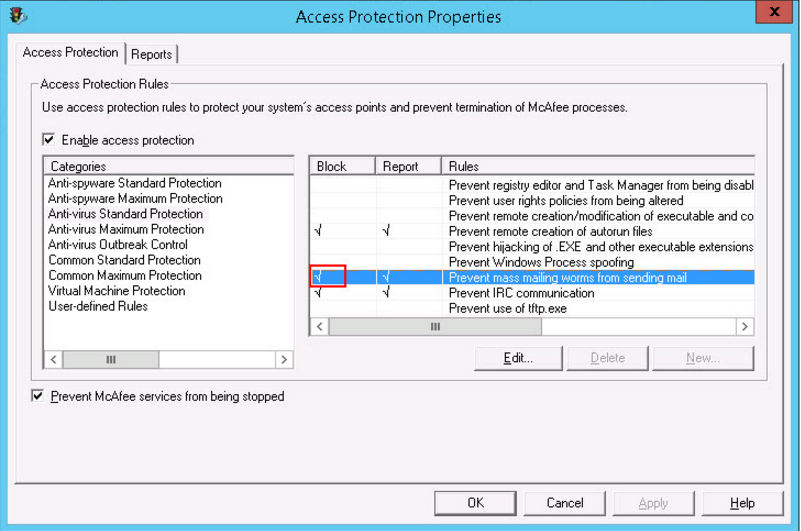 Note: If the antivirus software McAfee has been installed on the NetBrain Application Server (Web Server), you need to check whether the mass mailing service is blocked by the McAfee process as follows, which may cause the failure of mail delivery. |