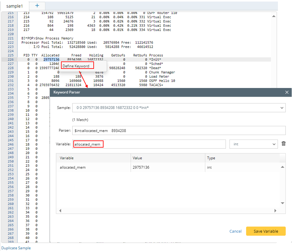 - Highlight the allocated memory value 8934208 in the sample data (do not include the spaces before and after the metric), and then click Define Keyword in the floating menu.
