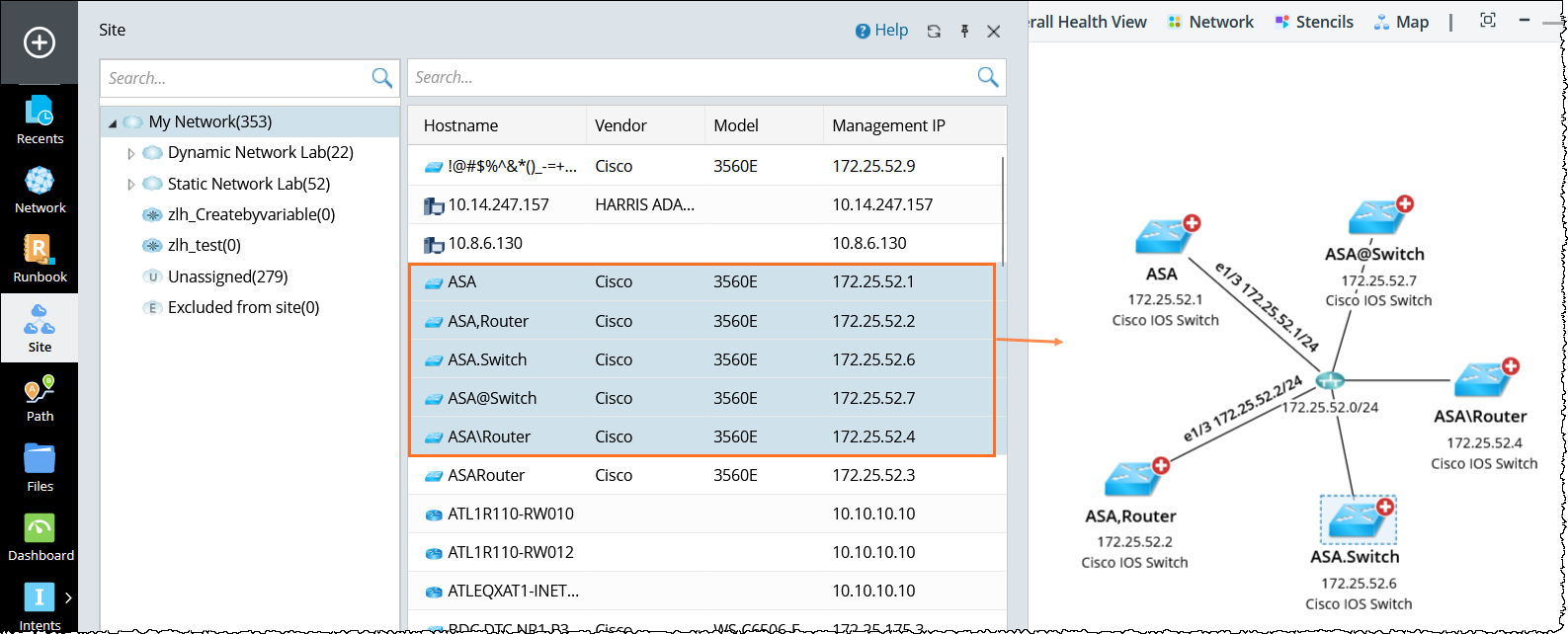 - To add devices to the Map, click Site or Network on the taskbar, or select Device Group from the start menu