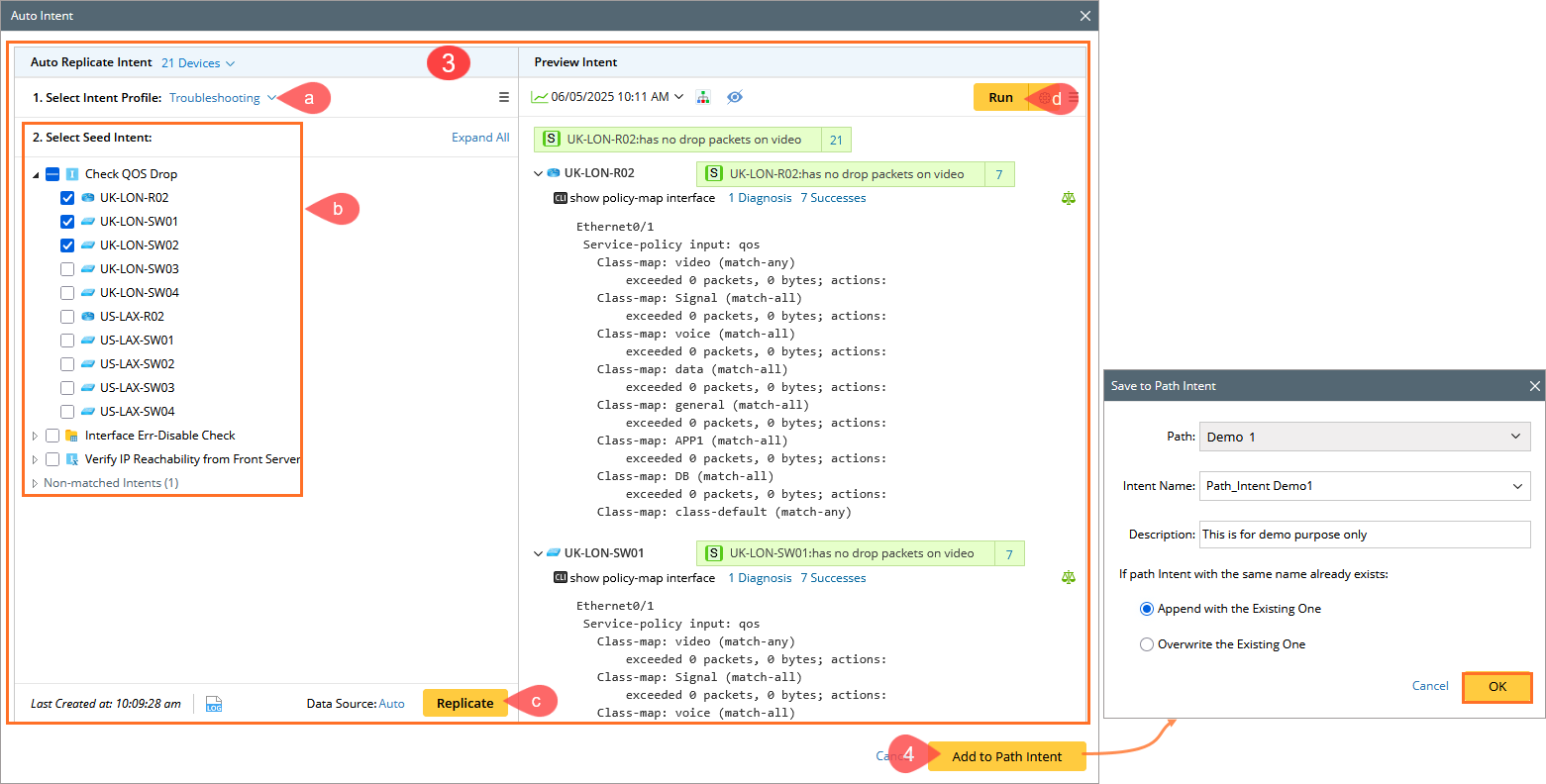 Note: If a path intent with the same name already exists, users can select to append the new path intent to the existing one or overwrite existing one.