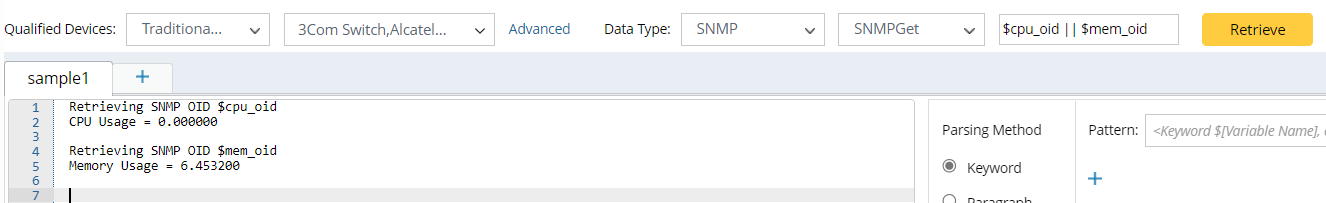 Note: SNMP Parser has two special built-in SNMP parameters: $cpu_oid and $mem_oid, representing a device's CPU and memory usage, respectively. When you use these two parameters in the Command field, select a device to retrieve data, and the system will automatically get the CPU usage and memory usage by looking up the corresponding OID of the device in the domain.