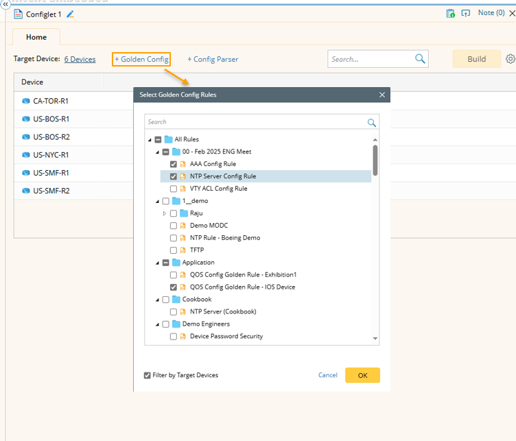 Note: In Select Golden Config Rules and Select Config Parser Variables dialog, the Filter by Target Devices checkbox is selected by default. his limits the available rules and variables to only those applicable to the selected devices, streamlining your selection process. |