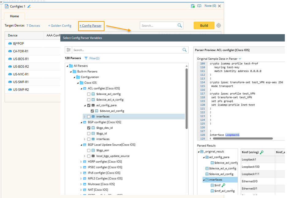 Click the + Config Parser link to open the Select Config Parser Variables dialog.
