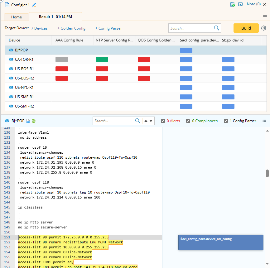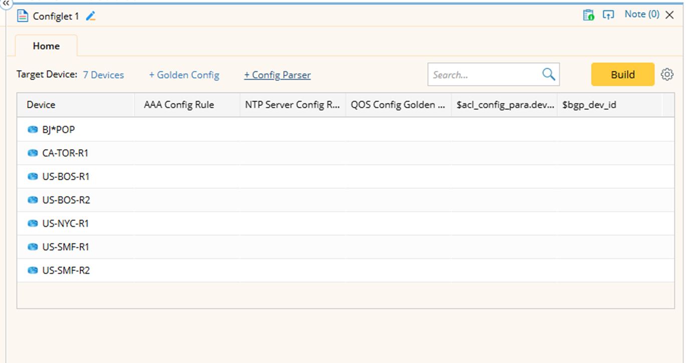 - Build the Configlet: Click Build to get configlets for each target device using the config files from the current baseline. As the build progresses, color blocks will gradually appear in the table indicating the status of configlets.