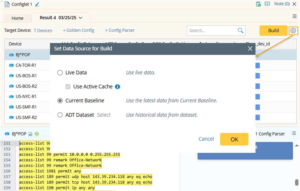 The data source used for building configlet is configurable. The default data source is Current Baseline.