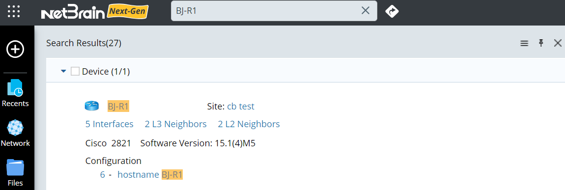 The Search bar in NetBrain acts like a Google search for any data within your network. Search helps you leverage the power of big data to ensure you can quickly find and visualize any relevant network information. Simply entering a free text string into the bar will run a search across your domain for matching any data element. For example: