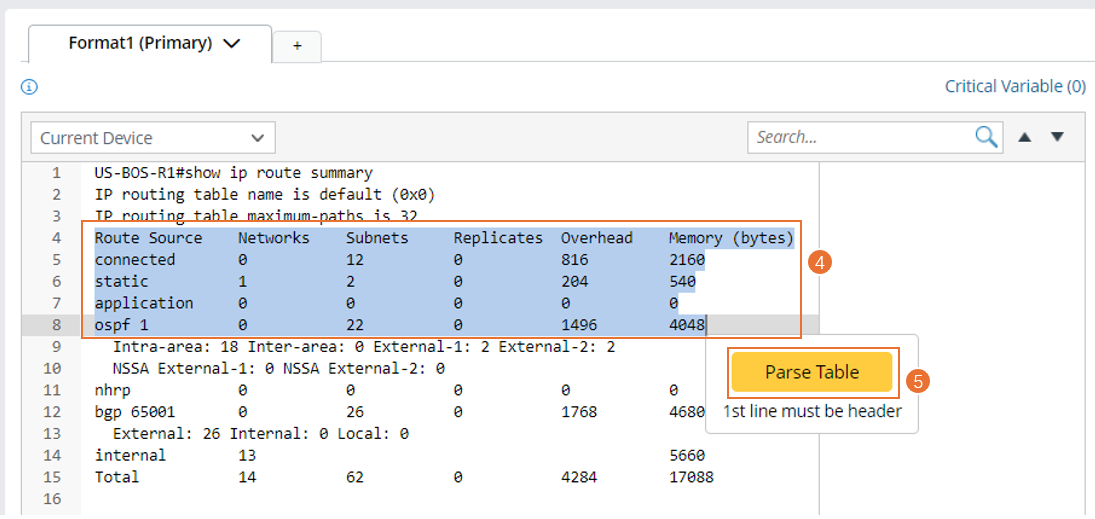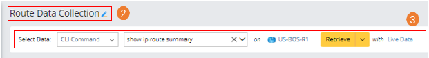 - Define to retrieve the "show ip route summary" CLI command data on device US-BOS-R1 with Live data as the data source.