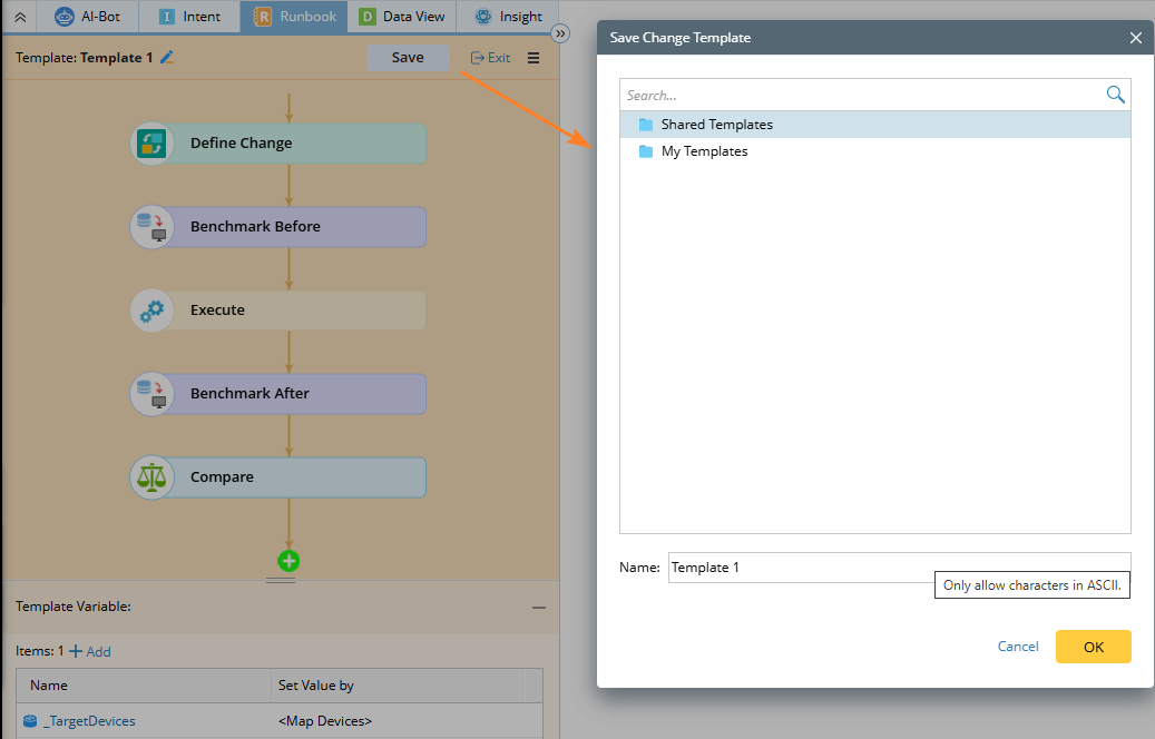 After defining the Network Change Template information, click Save, select a location in the pop-up dialog, enter a name, and click OK.