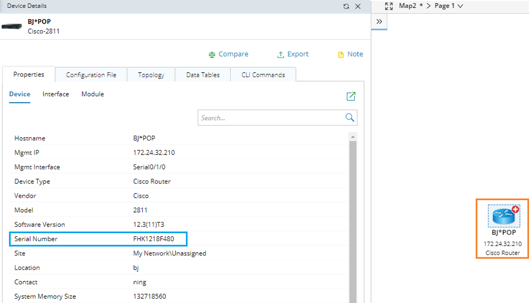 - Save and run the Qapp on a map with Cisco IOS switches included. Once the Qapp execution is finished, double-click a device to view whether the Serial Number field is populated in the Device Details pane.