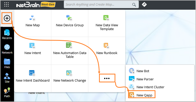 - Click the "+" icon from the taskbar, go to three dotted menu, and then select New Qapp from the drop-down menu. The Qapp Editor pane opens.