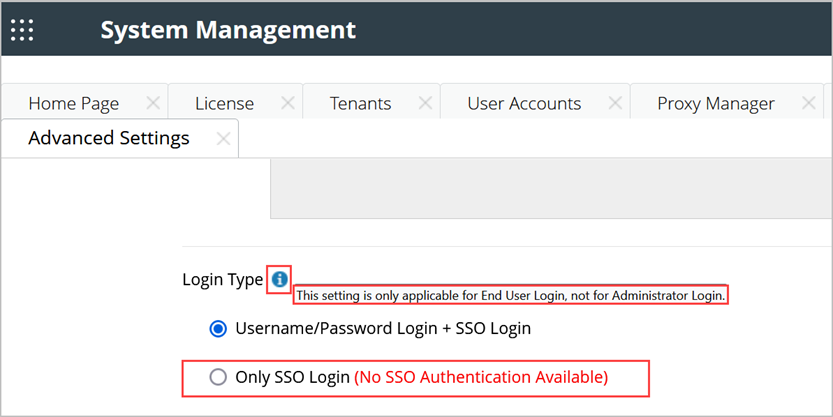 If SSO is not defined in external authentication, a red warning message (No SSO Authentication Available) will appear; otherwise, it will not be displayed