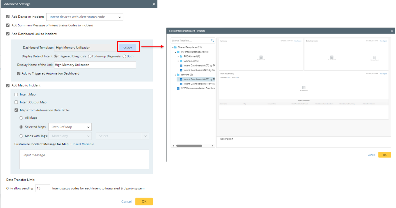 In Advanced Settings window, you can define the information about the triggered diagnosis to be pushed to incident, add dashboard link to incident, and set the number of intent status codes sent to the third-party system.