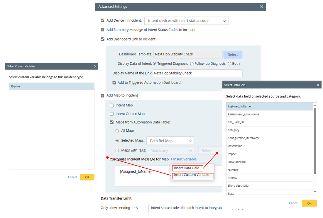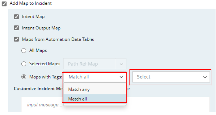 - Add Map to Incident: Three types of maps can be added (intent map, intent output map, maps from automation data table) to the incident pane.You can define the scope of maps from automation data table that will be displayed in Incident. Check the checkbox to select from the following three options.