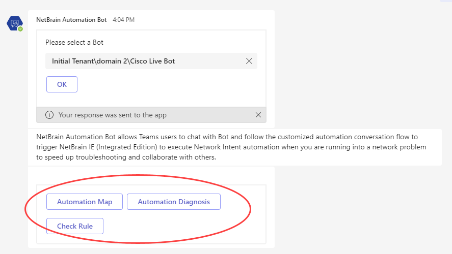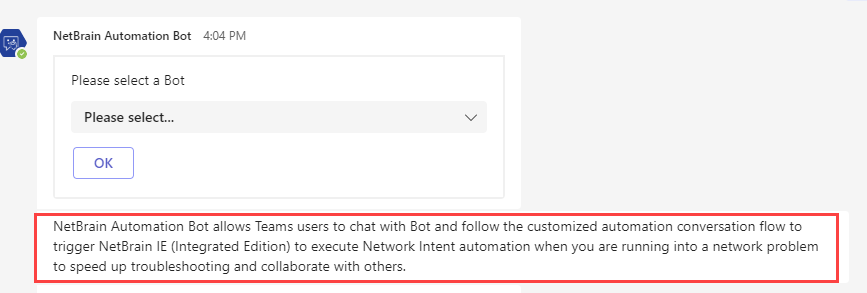 In NetBrain In Teams Bot Name End users can see the Bot name when selecting a bot. Greeting End users will see the greetings after selecting this Bot.