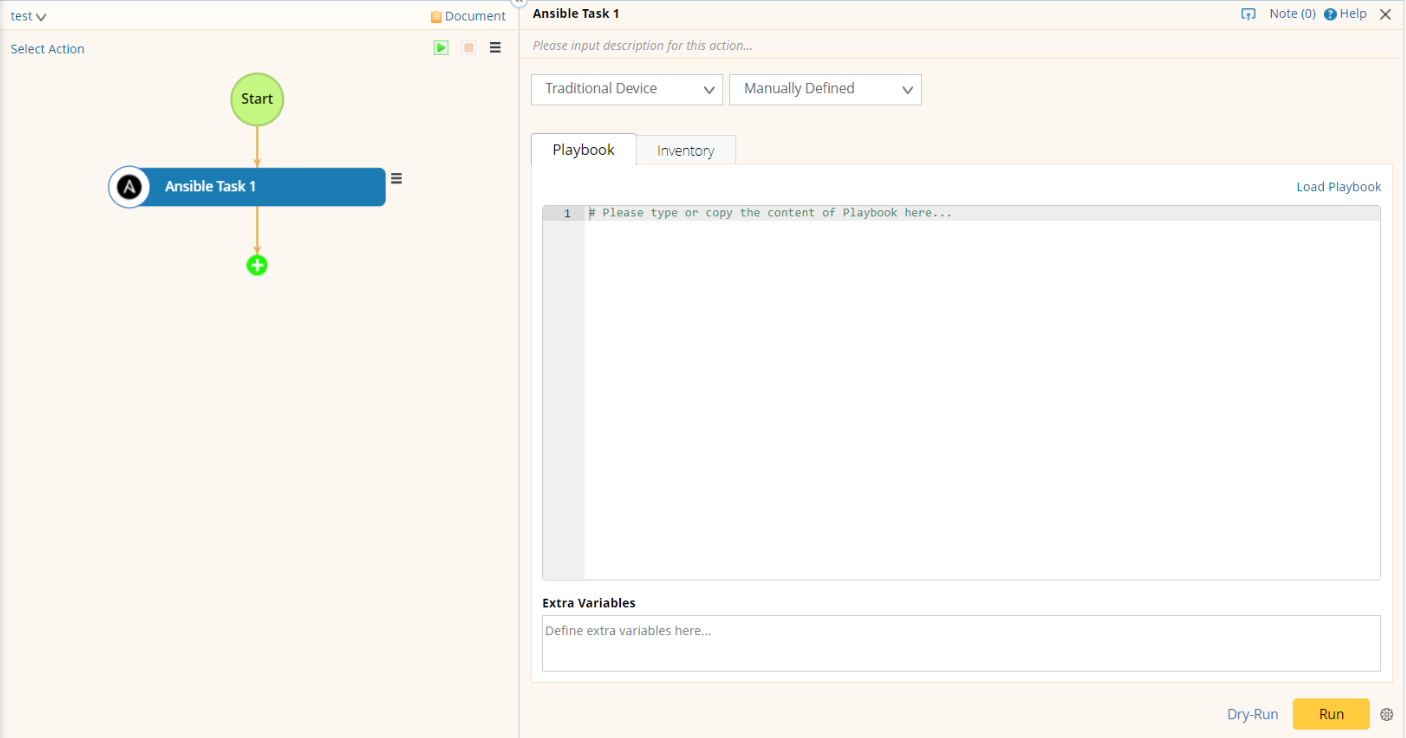 Note: Modifying device type or playbook creation method will clear the previously defined playbook, inventory, and extra variable configurations. |