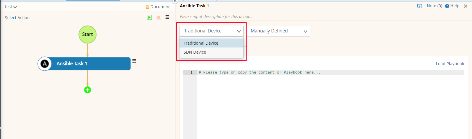 - Click Traditional Device to select Traditional Device (default) or SDN Controller (Cisco ACI), depending on the network devices to which this Ansible task is applied.