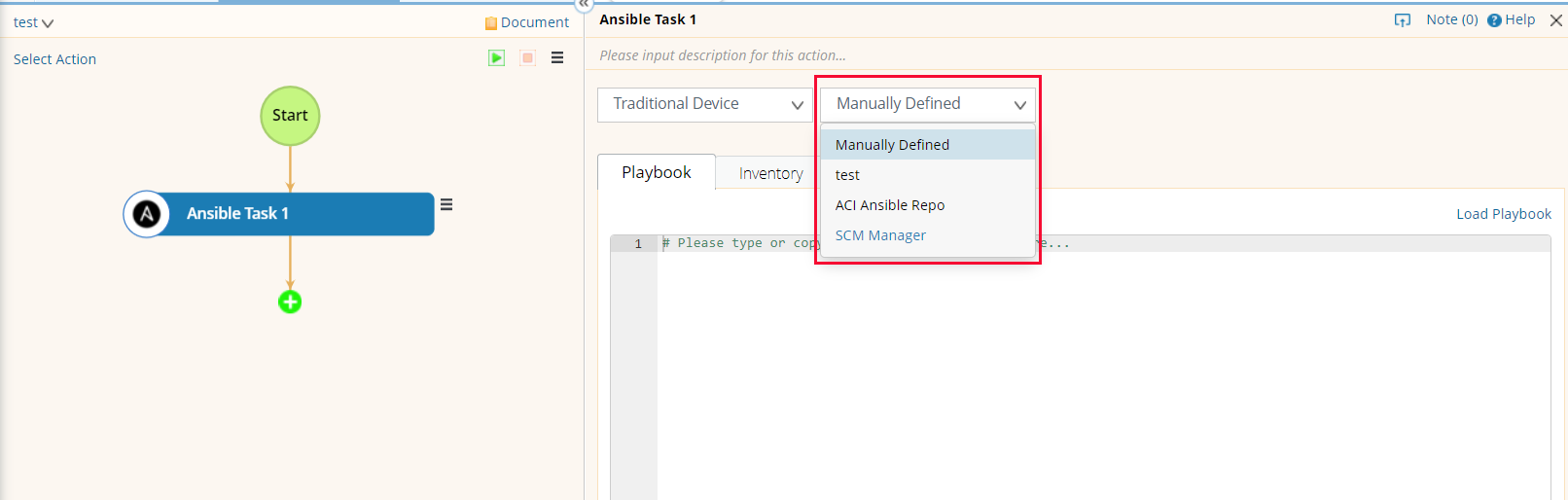 - Click the Manually Defined dropdown window to 1)manually define/import the playbook; 2) sync playbooks from the existing SCM; or 3) click SCM Manager to add a new SCM repo.