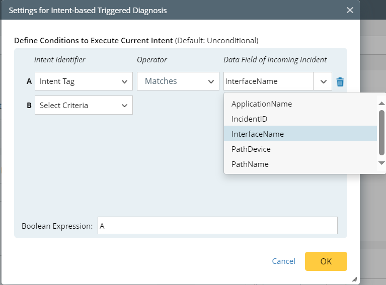After selecting the intent snow_webhook_auto_close, you will be directed to the Settings for Intent-based Triggered Diagnosis dialog to further define the conditions for executing the selected intent (for detailed steps, see Intent-based Triggered Automation). Or you can click Settings for Intent to open this dialog.