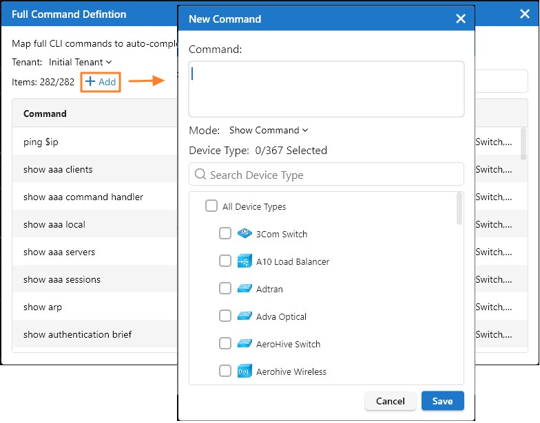 - In the Full Command Definition dialog, click Add to add a new full command in the current tenant.