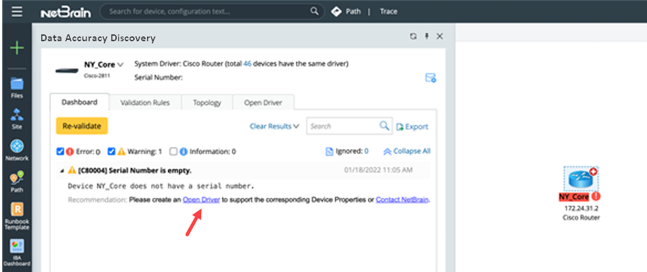 On the Data Accuracy Discovery pane, view the error message and click the Open Driver hyperlink under the message.