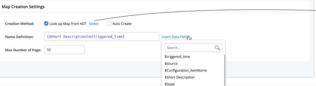 - Name Definition. Define a name for the map. Users can use static texts, data fields ($source/ $category/ $trigger_time/ others from the category), or a combination of both in the name.
