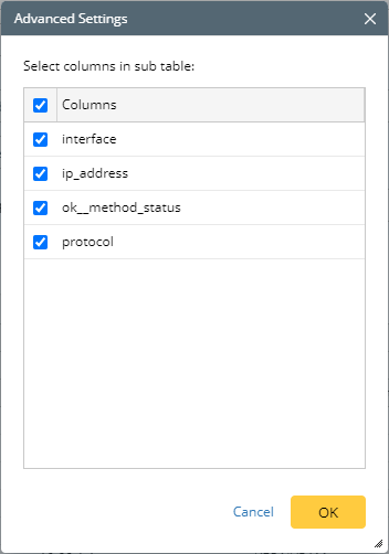 Complete the following steps to use sub table to filter table row by specified condition, for example, create a sub table to only keep the interface with the IP address configured.