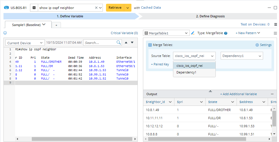 On the Define Variable tab for intent diagnosis creation, you can define different parsers, which will parse different variables. Add Parser from the Config and CLI command section and define the variables via Visual Parser. Visual Parser supports five types of variable definitions: Single Variable, Table, Paragraph, Collector, and Json Table. You can also directly click Auto Pattern to define a new parser via the auto parser function. See Add-on Parser for more details.