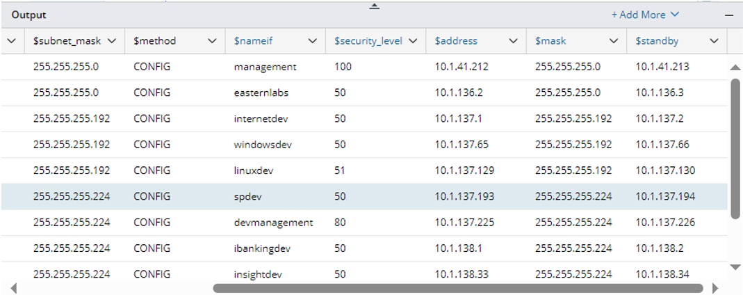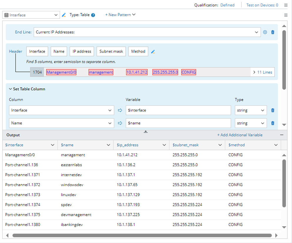 - Define a table pattern to parse device network configuration, and get variables $interface, $name, $ip_address, $subnet_mask, and $method.