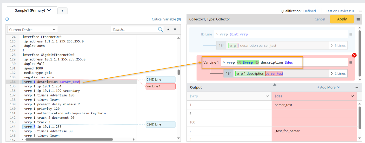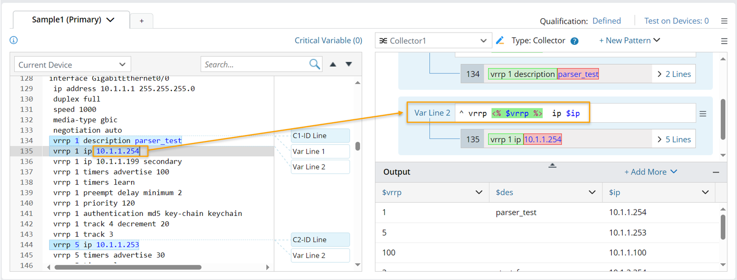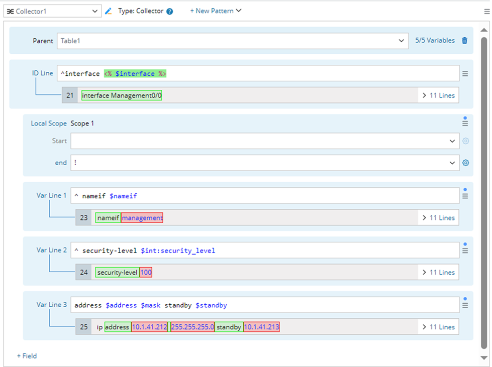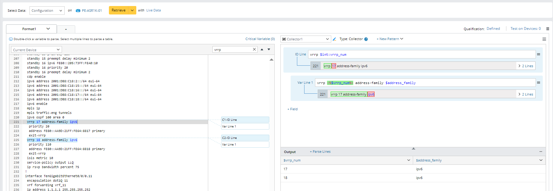 - Variable Template <% $var %> in Collector Parser: When the variable template is used, the variable in the var line is not defined in the form of $var. Instead, the variable in a var line is replaced with the corresponding string type variable based on the ID variable value of the current group. The Var line pattern with the variable template will match the input text. For example, if we define the line pattern "vrrp <%$vrrp_num%> address-family $address_family" for parsing the address family data for all vrrp, the variable template <%$vrrp_num%> means the system will parse matched values in this Var line in every group decided by the vrrp_num value. For more information about variable template, see Declare Variables/Variable Template <% $var %>.