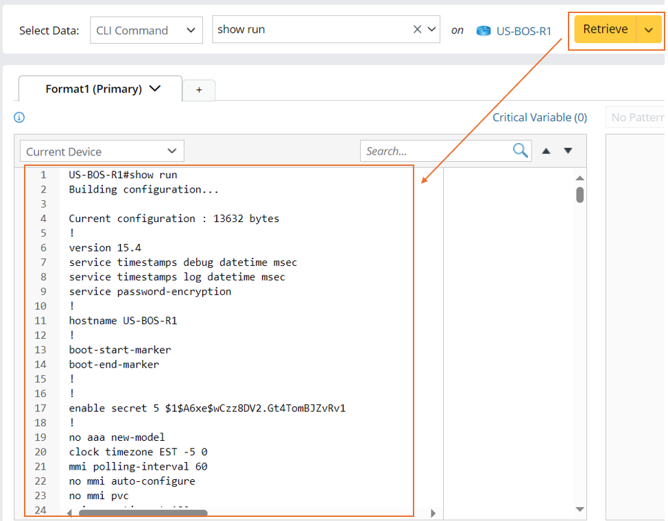 - Click the Retrieve button to retrieve the sample text. For more information on retrieving command data sources, see Data Source for Retrieving Data in Parser.