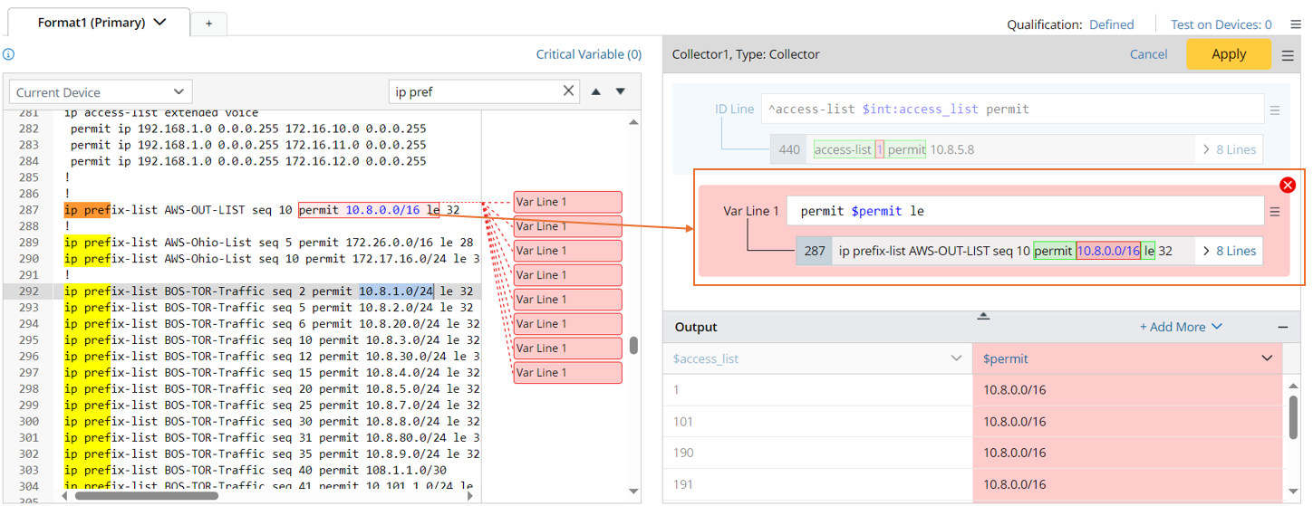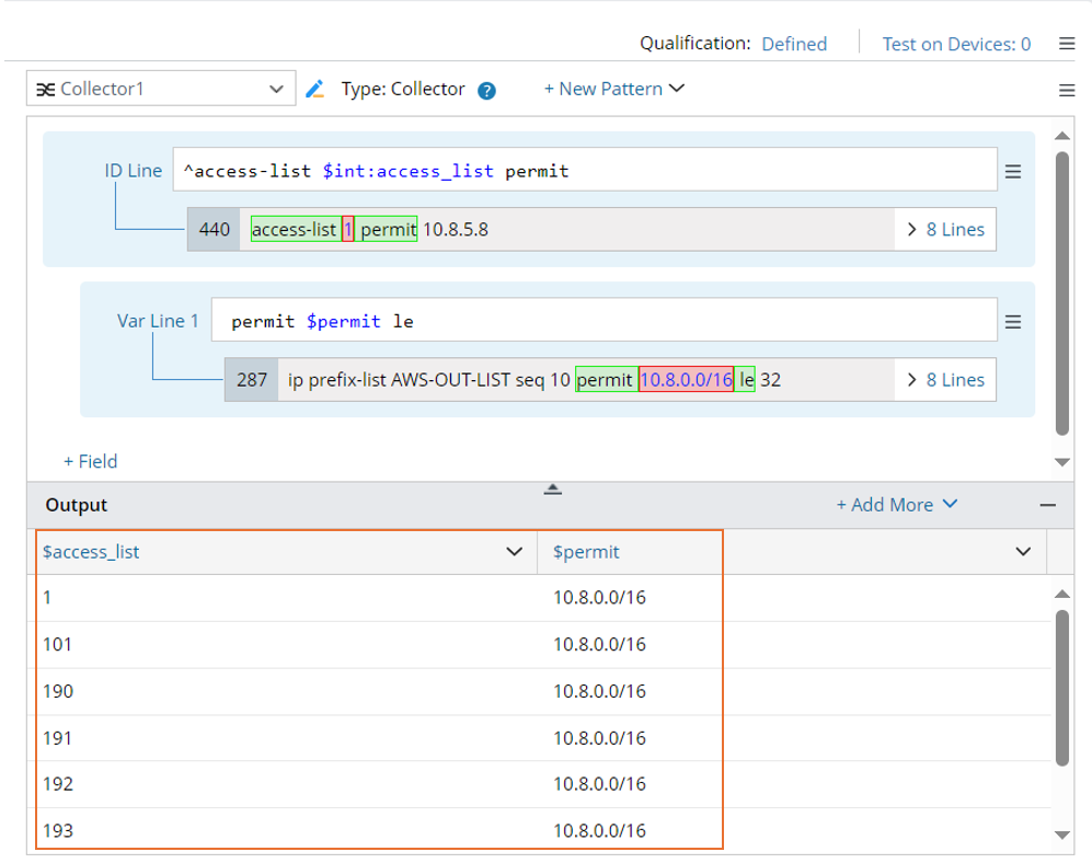 Note: If you continue to add variables, the existing line pattern and output will be disabled and cannot be modified. The new pattern and output (in red background) temporarily created by adding variables can be edited. - Select 10.8.0.0/16 in the Sample area to parse the permit data; then, a Variable Line 1 will be created.